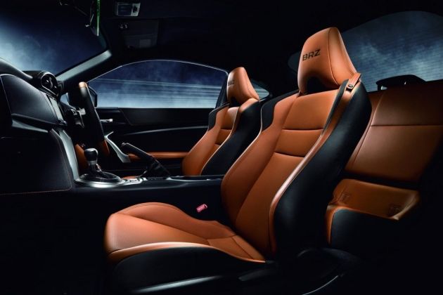 Салон особого BRZ имеет вставки из алюминия и карбона, а также кнопку запуска двигателя с логотипом STI. Интерьер обшит черной и коричневой кожей, а козырек приборной панели, боковины центральной консоли и верхние части дверей отделаны черной алькантарой с контрастной прострочкой.