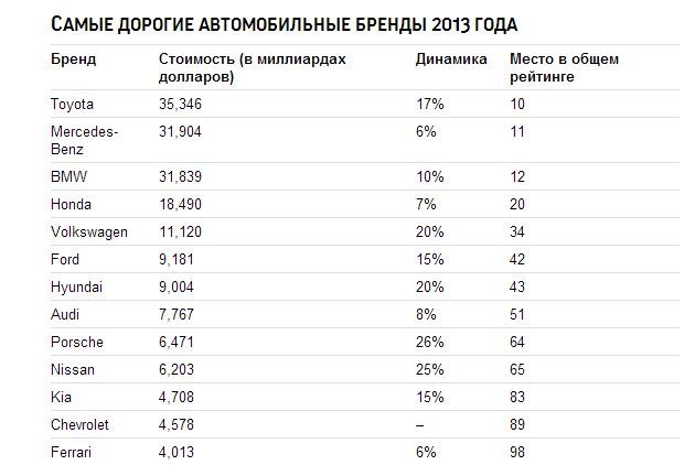 Вслед за «Тойотой» расположились Mercedes-Benz и BMW, занявшие одиннадцатое и двенадцатое места соответственно. Всего в «Топ-100» наиболее дорогостоящих компаний года попало 13 автомобильных производителей. При этом среди них впервые оказалась компания Chevrolet.