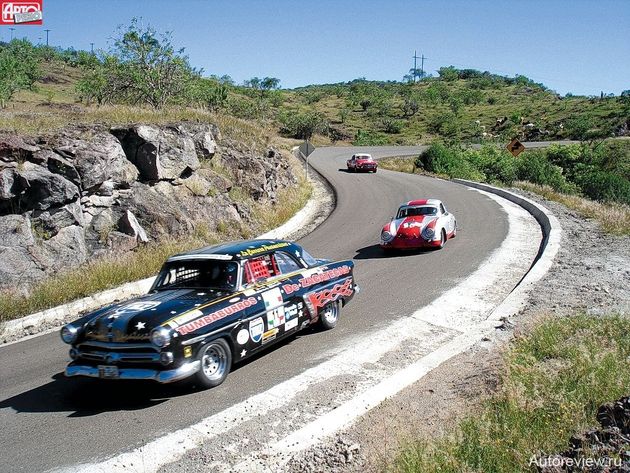 С 1988 года Carrera Panamericana проводится вновь — как пятидневная дорожная гонка классических машин с примесью современных спорткаров. На переднем плане — Ford 1954 года, а за ним — Porsche 356. Интересно, что лучшим достижением малолитражек Porsche в Мексике стало третье место родстера 550 в прощальном 1954 году. А вот «стоковые», то есть близкие к стандартным «американцы» уступали по скорости только гоночным Ferrari, Лянчам и Мерседесам — четыре заводских двухдверных седана Lincoln Capri в 1952 году заняли все места с седьмого по десятое