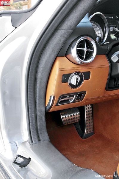 Mercedes SLS AMG кажется медленным только в одной ситуации — когда ты трогаешься с места. Преселективный «робот» Getrag здесь точно такой же, как и у новейших Ferrari, однако если Ferrari California и уж тем более бесподобная 458 Italia способны резко рвать с места вслед за акселератором, то SLS словно бережет диски мокрого «нечетного» сцепления. Газ в пол — и мягкий, с оттяжечкой, старт. «Это они настояли, — в ответ на мои претензии поднимал глаза к небу долговязый Вольф Циммерман, предводитель инженерных гуннов отделения AMG. — «Наверху» сказали, что SLS должен обладать истинно мерседесовским характером. Пришлось смягчить настройки…»