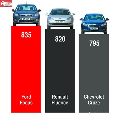 Экспертные оценки Авторевю Оцениваемые параметры Макс. балл Автомобили Почему? Chevrolet Cruze Ford Focus Renault Fluence Эргономика 200 170 170 165 В Renault — неудобное водительское сиденье. Обзорность Форда страдает из-за массивных передних стоек и самой большой неочищаемой зоны левого дворника Рабочее место водителя 100 85 90 80 Обзорность 100 85 80 85 Динамика 330 270 290 275 Фордовский мотор не только мощнее, но и хорошо настроен. На Renault сложно плавно тронуться, переключиться или ускориться, а Chevrolet огорчает вялой динамикой и худшей четкостью переключений передач. По управляемости Focus и Fluence примерно одинаковы, а у Круза — ощущение «синтетики» в рулевом приводе Разгонная динамика 100 75 85 75 Тормозная динамика 120 105 110 105 Управляемость 110 90 95 95 Ездовой комфорт 250 180 200 210 Renault отлично «глотает» ямы и, если не «крутить» мотор, радует хорошей шумоизоляцией. Cruze разные неровности воспринимает по-разному, а Focus — все одинаково, причем хорошо. У Chevrolet — подслеповатая «ручная печка», а у конкурентов — двухзонный климат-контроль Плавность хода, виброзащита 90 65 70 75 Акустический комфорт 80 60 60 65 Микроклимат 80 55 70 70 Комфорт салона 220 175 175 170 На задние сиденья Фокуса сложнее «протащить» ноги, но сидеть на высоком диване удобнее. У Renault чуть больше запас места в коленях, но, в отличие от Chevrolet, тесно ступням. Большой багажник Флюенса портят громоздкие петли, сложная схема трансформации и зауженный «лаз» в салон Пассажирские места 90 75 75 75 Багажник 80 60 65 70 Трансформация салона 50 40 35 25 Суммарный балл 1000 795 835 820