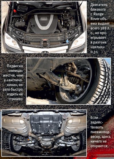 Четвертому поколению RR предъявить, кажется, нечего. Но если хорошо поискать, то можно. Возьмем, к примеру, разгон. GL делает 100 км/ч за 6.5 секунды, а Range Rover – за 6.2. Одинаковую с «англичанином» динамику «немец» достигает при помощи 388 лошадиных сил. Гарвардскому же факиру для мизерного преимущества в 0.3 секунды нужны все 510! Нельзя не заметить столь фатальную разницу в прилагаемых усилиях. К тому же английский индюк слишком жирный: GL на 300 кг легче. Такие вот «невкусные», чисто немецкие аргументы приходится использовать для Mercedes-Benz, который в свое время на первых тестах в России потряс внедорожных журналистов своими способностями.