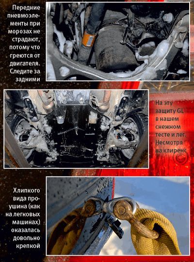 Нечто подобное уже произошло в области геометрической проходимости. И в RR, и в GL мы сами регулируем подвеску, поднимая с помощью пневматики кузов в нужное положение. Кстати, верхний предел регулируемого дорожного просвета у соперников 283–307 мм. Что еще роднит эти внедорожники? Оба автомобиля построены по аналогичной схеме: несущий кузов, независимые подвески спереди и сзади, пониженная передача в раздаточной коробке. Плюс блокировки – межосевая и задняя межколесная. Но управление блокированием уже из области различий наших соперников. GL позволяет включать блокировки вручную. RR оставляет это право за собой, включая их только в автоматическом режиме. У Mercedes-Benz есть похожий алгоритм, но гораздо менее умный, в рыхлом снегу он бесполезен.