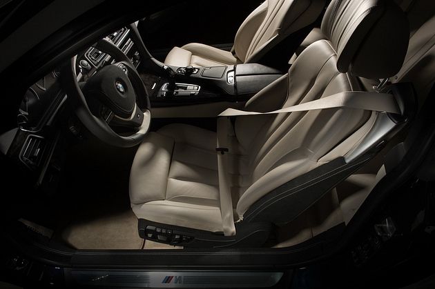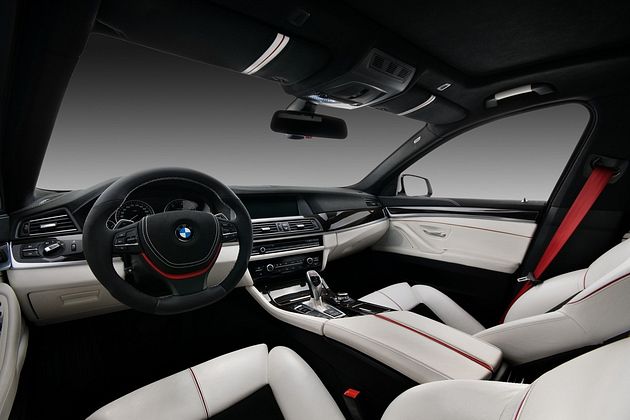 Интерьер «пятерки» получил черно-белую отделку салона. Алькантары здесь используется меньше, зато появились контрастные красные полоски. В красном цвете выполнены полоски на креслах и подлокотнике, ремни безопасности и часть рулевого колеса.