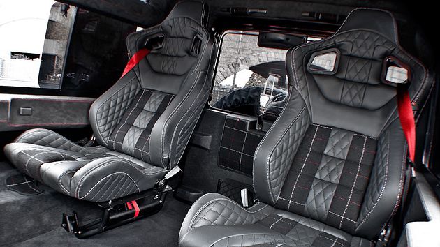 В салоне зимнего «Дефендера» появились четыре спортивных сидения, обтянутые черной кожей Nappa с серебристой прошивкой и ярко красными ремнями безопасности, а также «перчаточный» ящик, отделанный кожей и серой алькантарой. Приборную панель, украшенную часами Churchill, оформили вставками черного дерева.