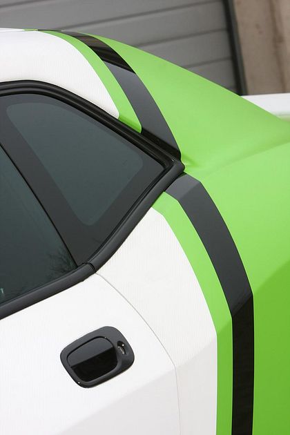 Первым делом забудьте о привычных цветовых решениях, предлагаемых менеджерами «Доджа» в официальных салонах. Challenger SRT-8 CCG предстает в кислотном зеленом оттенке, двери с крышей которого выкрашены в белый цвет с дополнительной черной линией в задней части кузова. Через весь борт, как и полагается мускулистым жеребцам из Мичигана, простираются две полосы, начинающиеся с капота и заканчивающиеся крышкой багажника.